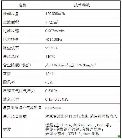 改造后袋除塵系統技術要求:處理風量≥420000m3/h;標態下出口濃度≤30mg/m3;標態下壓縮空氣≤4m3/min;阻力≤1300Pa。