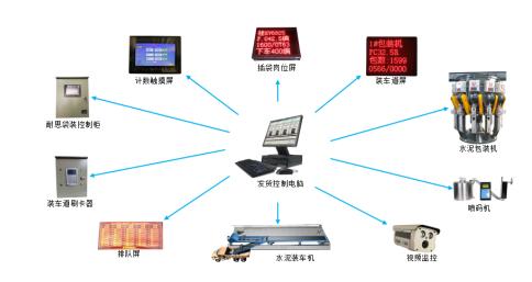 耐思袋裝水泥智能發貨控制系統由上位機中控系統、包裝機、裝車機、噴碼機、計數系統、自動擋包裝置、自動扳道裝置、PLC控制系統、裝車道刷卡終端、LED指示系統、聲光報警系統、視頻監控系統、數據傳輸系統組成。