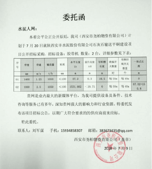 昨日(7月9日),西安堯柏物資有限公司致函水泥人網,鑒于水泥人網是業內最大的新媒體平臺,在水泥行業有著很大的影響力和行業資源,特委托對2臺膠帶機的項目進行采購。