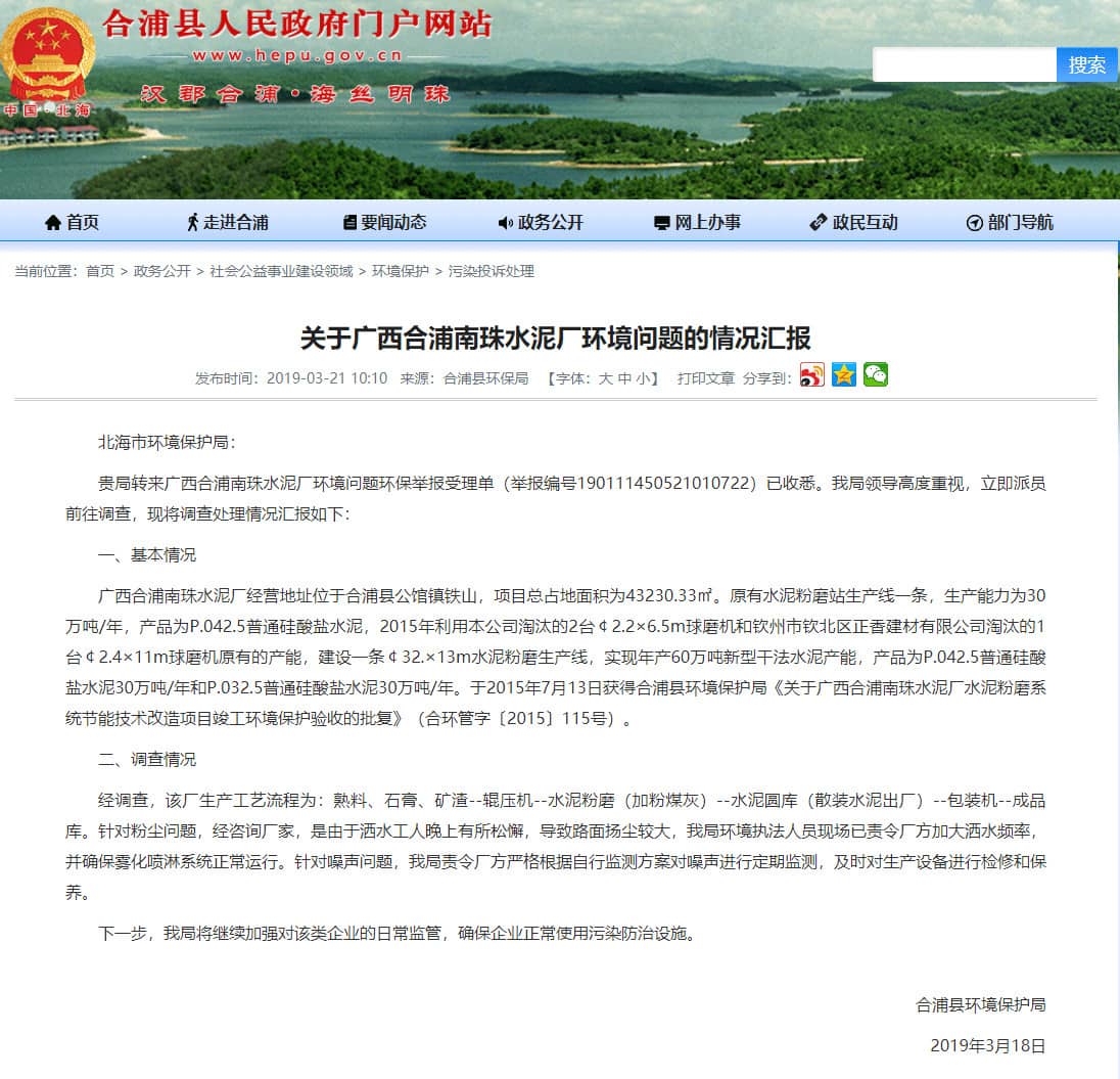 日前,合浦縣人民政府門戶網(wǎng)站發(fā)布了來源合浦縣環(huán)保局的《關(guān)于廣西合浦南珠水泥廠環(huán)境問題的情況匯報(bào)》稱: