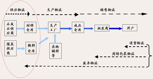 水泥行業的物流按業務環節產生先后順序分為供應物流、生產物流和銷售物流三部分,如圖1,其中供應物流和銷售物流對水泥企業的影響最大。