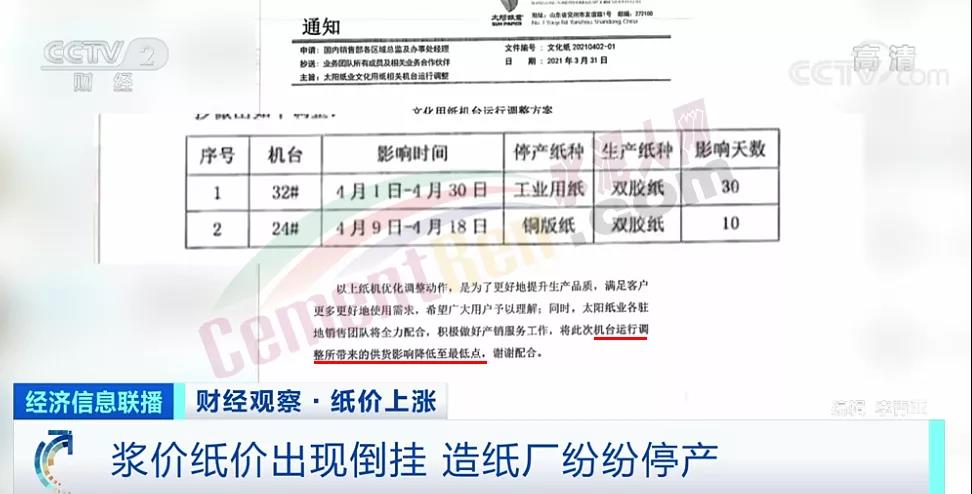 與此同時,“紙廠紛紛停產”也沖上微博熱搜。山東太陽集團宣布,4月份對工業用紙和銅板紙紙機進行優化調整;山東華泰紙業發布通知,計劃5月上旬對銅板紙紙機停產維保;晨鳴紙業決定于5月中上旬對文化紙機臺停機檢修10天。