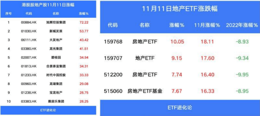 港股地產板塊漲幅驚人,旭輝控股漲72%,新城發展漲超53%,龍光集團漲超41%,碧桂園漲近35%;A股陽光城、綠地控股、華發股份、新城控股、保利發展、廣宇集團、萬科A等多股漲停。房地產ETF漲幅達到10%,沖擊漲停板,地產ETF漲超9%,房地產ETF基金上漲7%。
