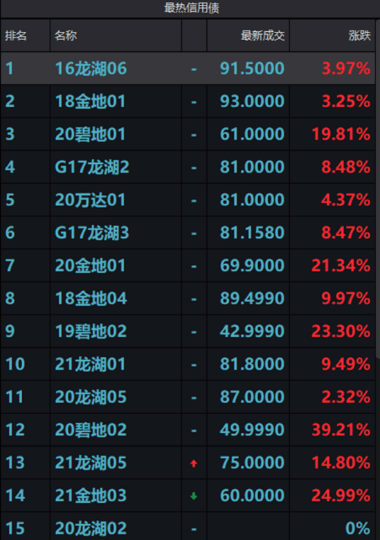 地產債大幅上漲,“20金地01”漲超21%,“20碧地01” “19碧地02”漲超19% ,“21龍湖05”漲近15%。
