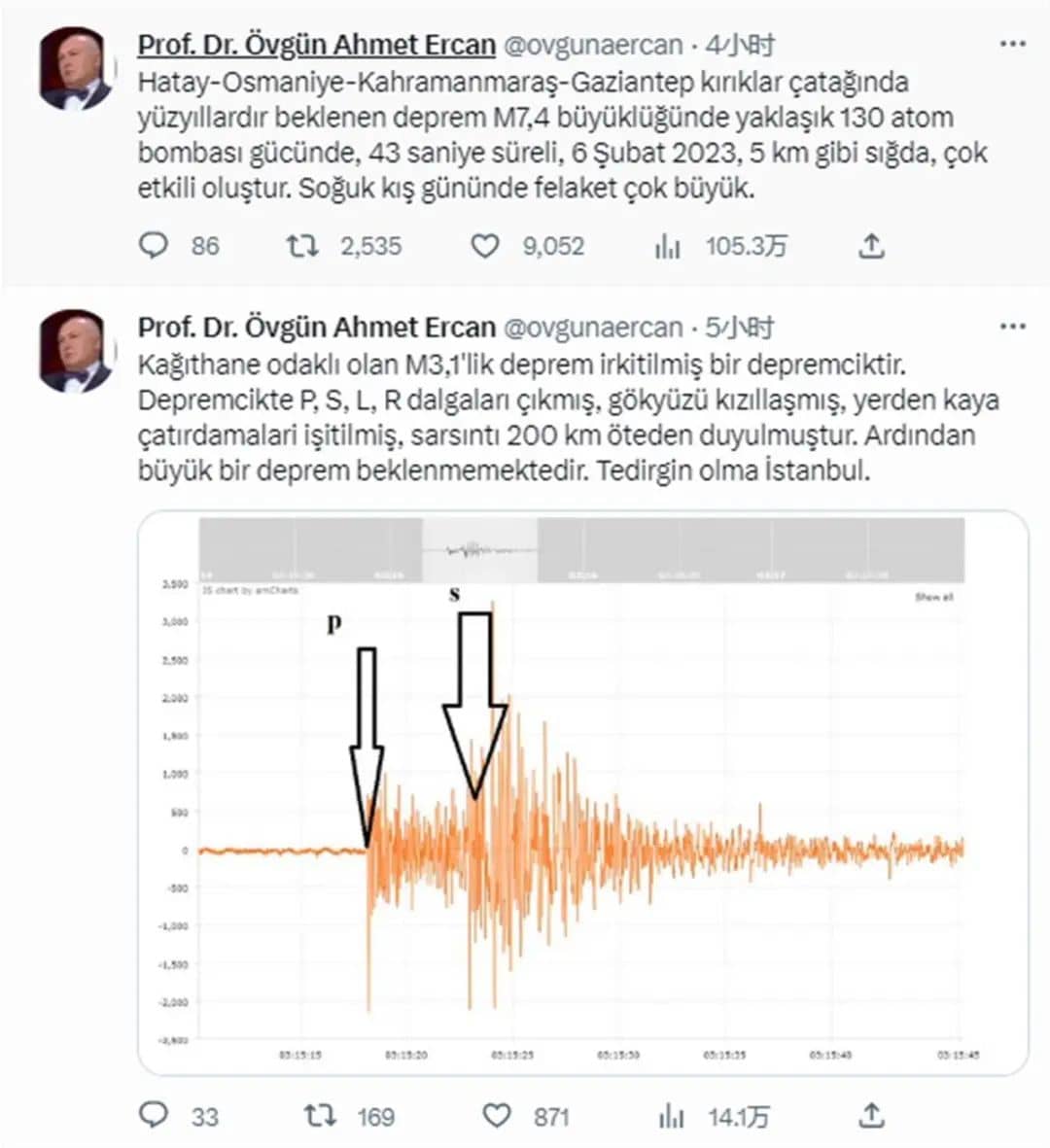 地震發(fā)生后,土耳其地震專家艾哈邁德·奧文·埃爾詹在推特上表示,地震發(fā)生的地方在四個(gè)主要斷裂帶的交界處,威力約為130顆原子彈持續(xù)爆炸了43秒。
