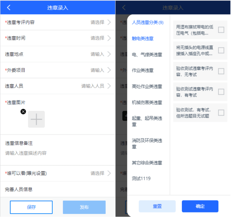 平臺中內置了違章考評標準庫,水泥企業單位管理員在作業現場可通過安培空間APP進行拍照記錄人員違章行為后,選擇違章考評標準快速規范地錄入違章。系統將根據違章考評內容,自動扣減人員違章記分,并自動下發反違章培訓學習任務。