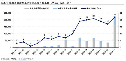 根據(jù)上海票交所2月10日公布名單,1月共1554家主體出現(xiàn)承兌人逾期現(xiàn)象,其中發(fā)債城投22家,較12月增加5家。主體類(lèi)型方面,18家為新增主體,4家為存量主體;逾期規(guī)模方面,當(dāng)月城投票據(jù)逾期發(fā)生額累計(jì)約22.5億元,環(huán)比大幅增加19.0億元,其中新增主體累計(jì)逾期發(fā)生額16.7億元,存量主體新增逾期發(fā)生額5.8億元。