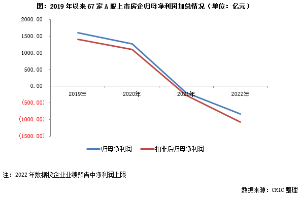按上述67家房企預(yù)計(jì)的凈利潤(rùn)上限計(jì)算的話(huà),這些企業(yè)的歸母凈利潤(rùn)總虧損839億元,扣非歸母凈利潤(rùn)總虧損1073億元(下限1439億元),虧損規(guī)模同比大幅增加。