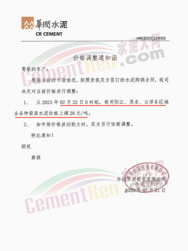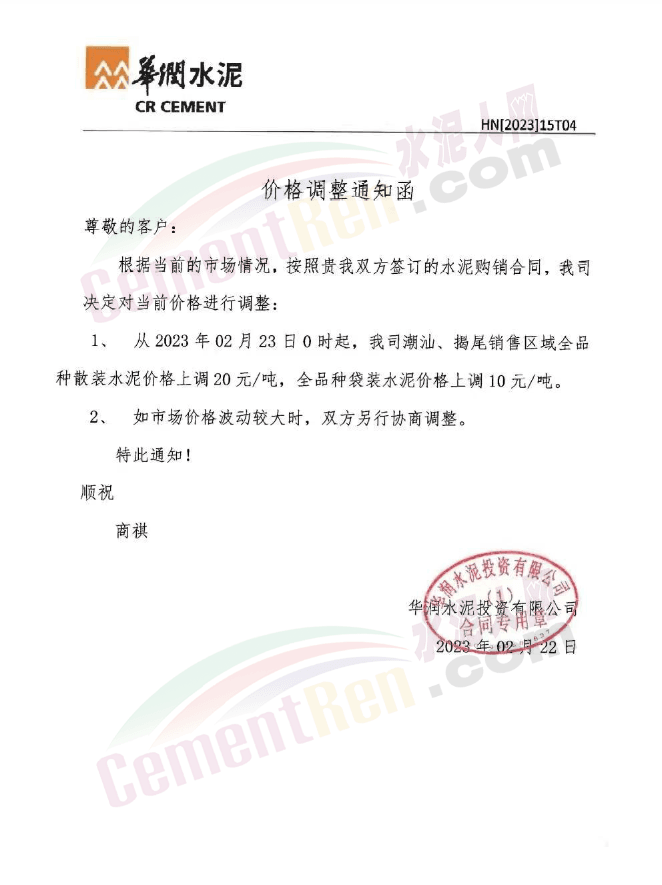華潤水泥通知從2023年2月23日0時起,廣州、東莞、深圳、佛山、肇慶、中山、珠海、江門、惠州、湛江各區域全品種散、袋裝水泥價格上調20元/噸;陽江、茂名、云浮各區域全品種散裝水泥價格上調20元/噸;潮汕、揭尾銷售區域全品種散裝水泥價格上調20元/噸,全品種袋裝水泥價格上調10元/噸。