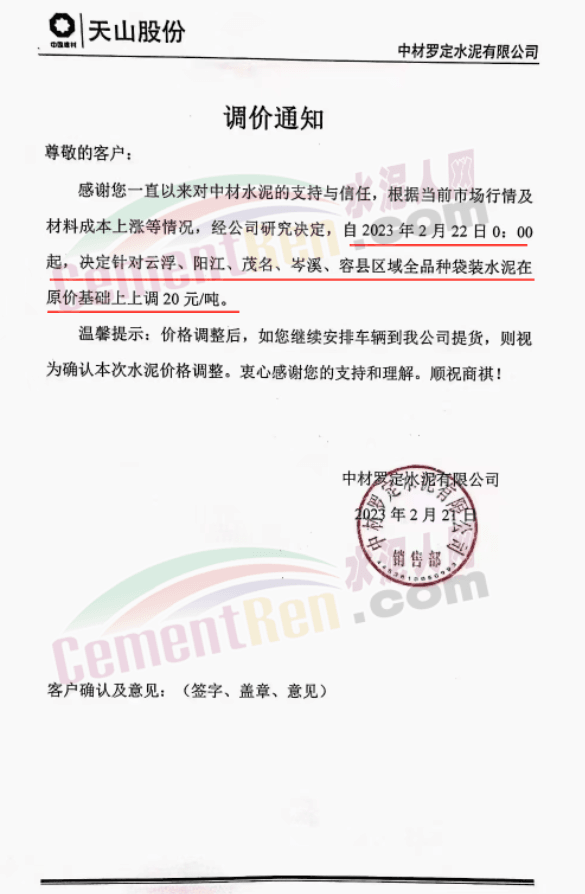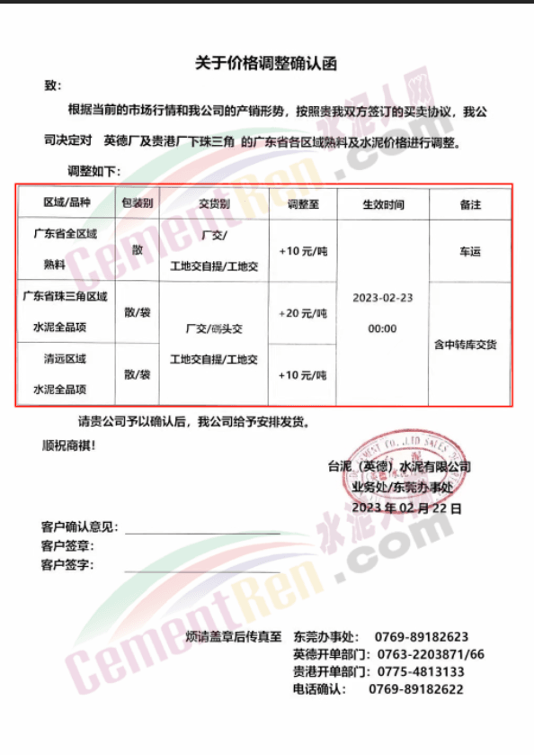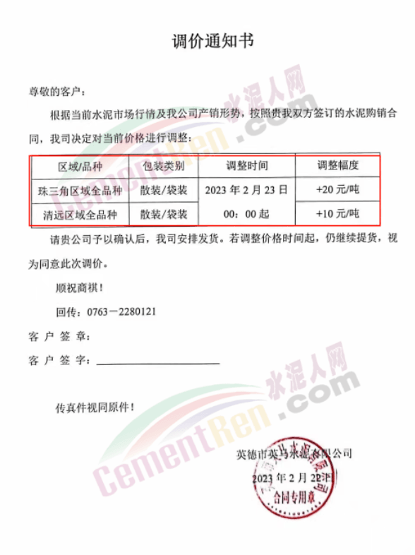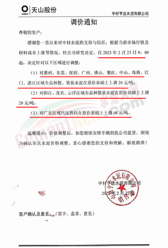 中材亨達水泥有限公司通知,根據當前市場行情及材料成本上漲等情況,經公司研究決定,自2023年2月23日0時起: 對惠州、東莞、深圳、廣州、佛山、肇慶、中山、珠海、江門、湛江區域全品種散、袋裝水泥在原價基礎上上調 20 元/噸;對陽江、茂名、云浮區域全品種散裝水泥在原價基礎上上調20 元/噸;對廣東區域汽運熟料在原價基礎上上調10元/噸。