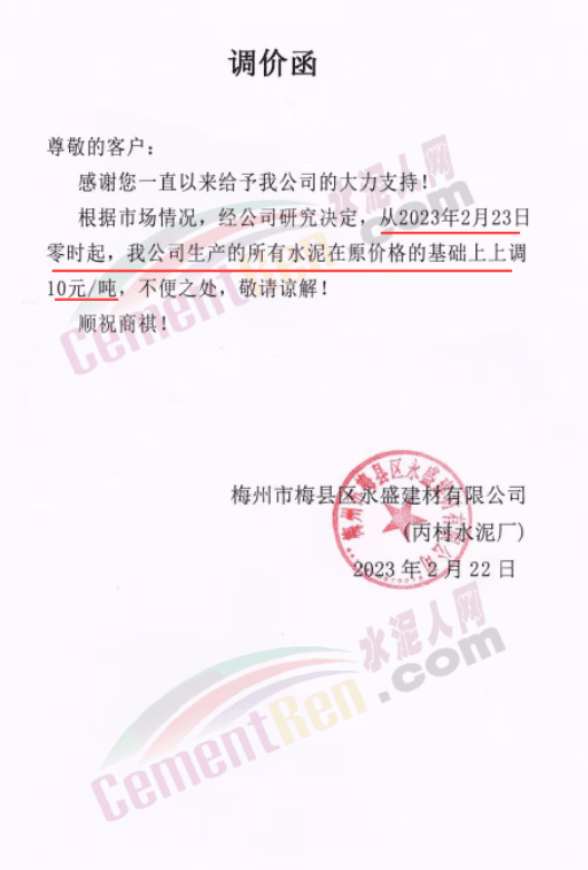梅州市梅縣區永盛建材有限公司通知,2月23日零時起,所有水泥上調10元/噸。