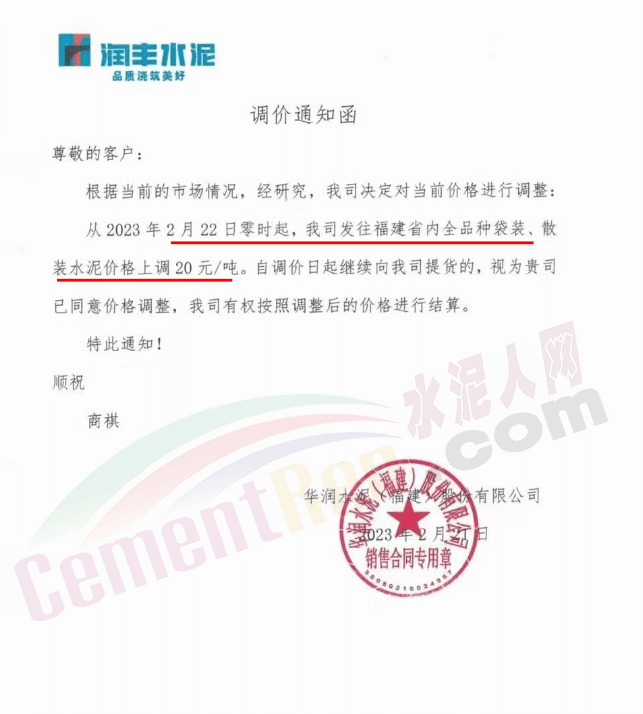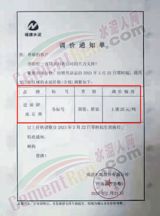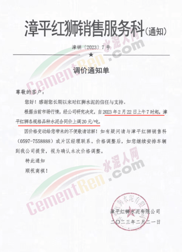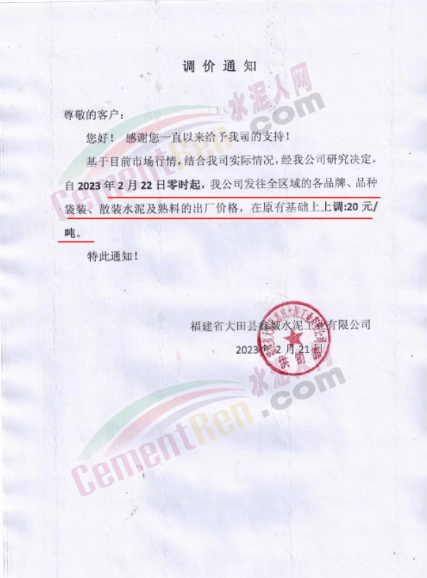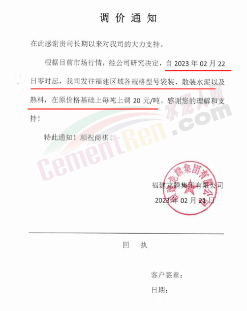 福建龍麟集團通知自2023年2月22日零時起,公司發往福建區域各規格型號袋裝、散裝水泥以及熟料,在原價格基礎上每噸上調20元/噸。