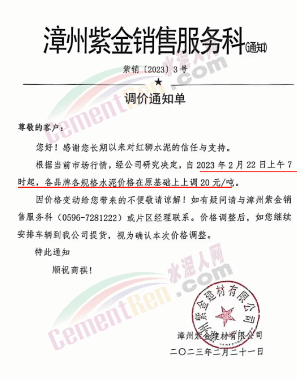 漳州紫金銷售服務科通知2月22日上午7時起,上調水泥價格20元/噸。