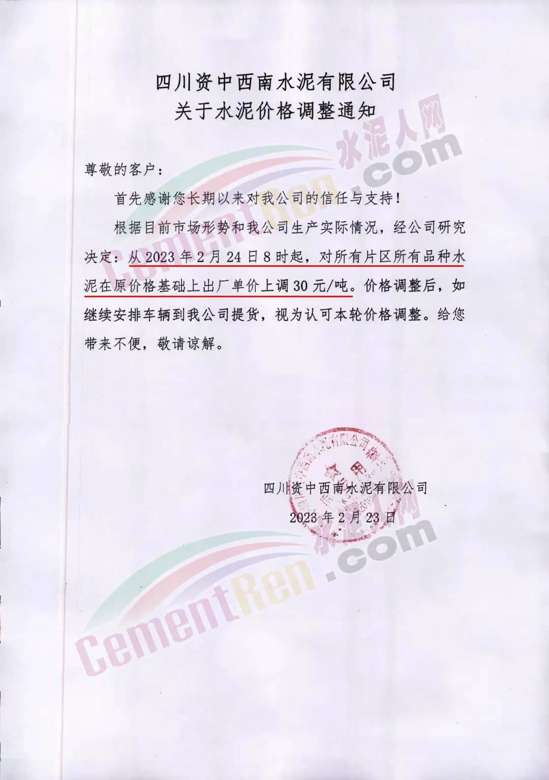 四川威遠西南水泥有限公司通知,根據目前市場形勢和公司生產實際情況,經公司研究決定從2023年2月24日8時起,對所有片區所有品種水泥在原價格基礎上出廠單價上調 30 元/噸。