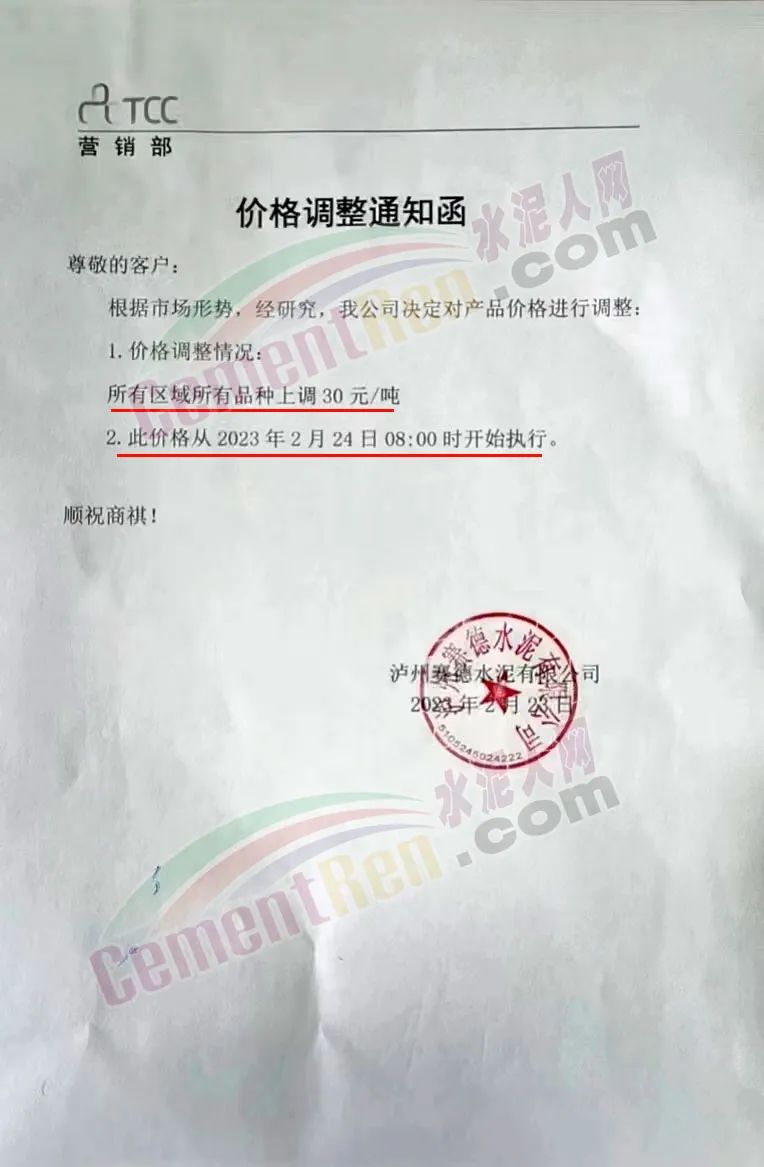 瀘州賽德水泥有聚公司通知從2023年2月24日8時開始,所有區域所有品種上調30元/噸。