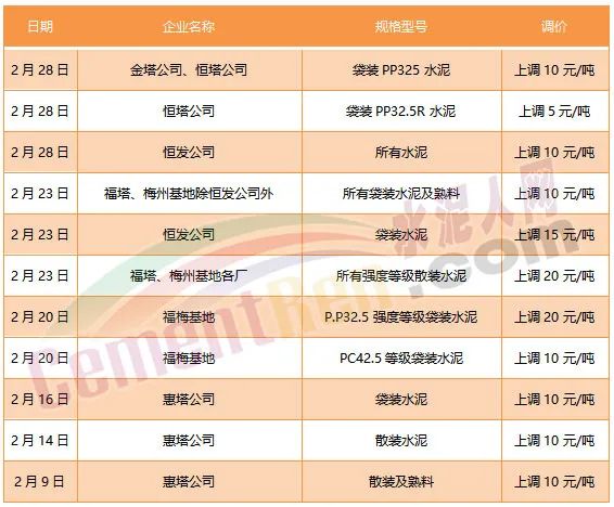 2月23日:福塔、梅州基地除恒發公司外其余生產企業所有袋裝水泥及熟料出廠結算價格分別在現行價格基礎上上調10元/噸;恒發公司袋裝水泥出廠結算價格分別在現行價格基礎上上調15元/噸;福塔、梅州基地各廠所有強度等級散裝水泥出廠結算價格分別在現行價格基礎上上調20元/噸。