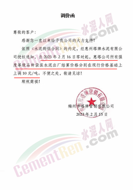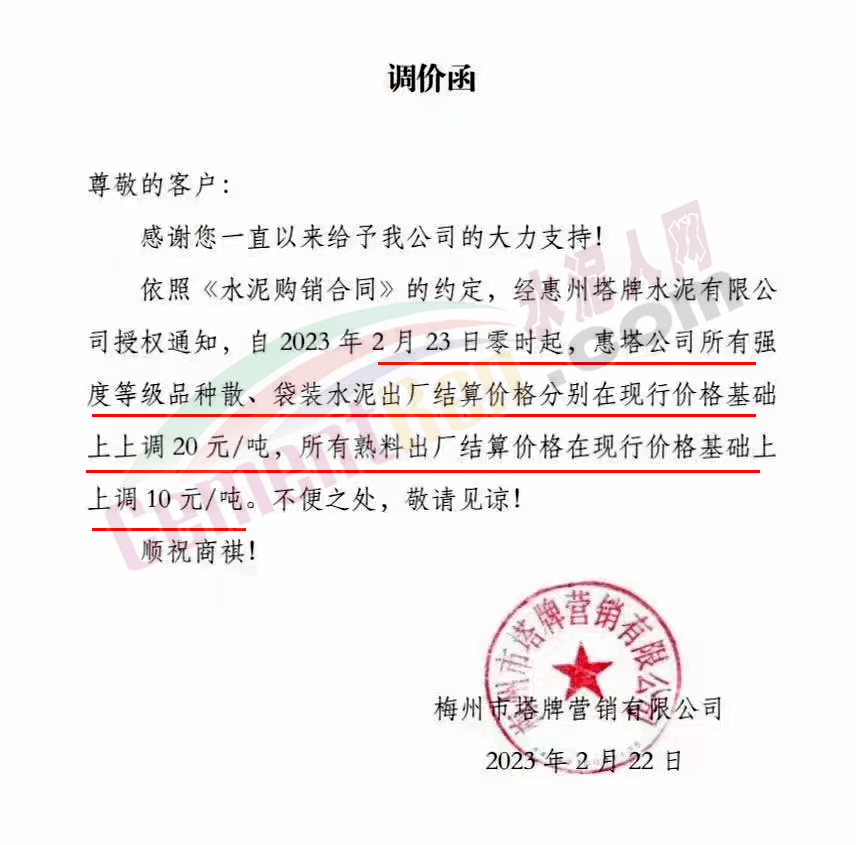 水泥人網通訊員消息,日前梅州市塔牌管銷有限公司通知,自2023年2月28日零時起,梅州基地金塔公司、恒塔公司所有袋裝PP325水泥結算價格分別在現行價格基礎上上調10元/噸;恒塔公司袋裝PP32.5R水泥結算價格在現行價格基礎上上調5元/噸;恒發公司所有水泥出廠結算價格分別在現行價格基礎上上調10元/噸。