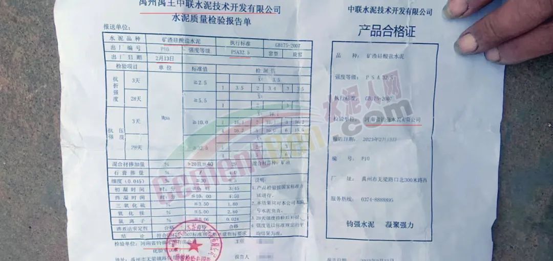 日前,河南省南陽市某建材門市向水泥人網反映:“許昌禹州禹王中聯(PSA32.5)袋重不足,廠方所提供的質量檢驗報告單與攪拌站所測數值,相差甚遠”。
