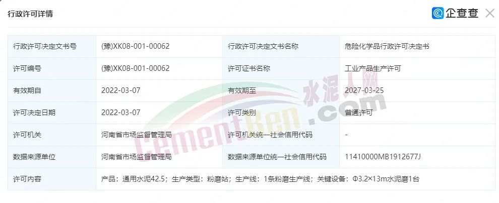企業生產許可證編號:(豫)XK08-001-00062,有效期至2027年3月25日。產品為通用水泥42.5;生產類型為粉磨站;擁有一條粉磨生產線;關鍵設備為Ф3.2╳13m水泥磨1臺。