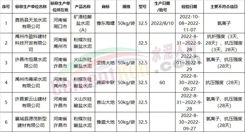 不合格品抽檢產品分別為礦渣硅酸鹽水泥(A)、粉煤灰硅酸鹽水泥、火山灰硅酸鹽水泥;標稱單位分別為鹿邑縣天龍水泥有限公司、禹州市盈科建材科技開發有限公司、許昌市恒晟水泥有限公司、禹州市雍梁水泥有限公司、許昌紫云山建材有限公司、襄城縣源茂新型建材有限公司,主要不符合項目為氯離子、抗壓,抗折強度。不合格品商標分別為豫東海螺、堅鑄大地、雍梁中聯、首山大地、豫盛大地。