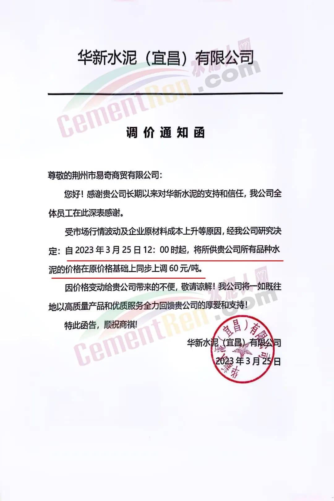 華新水泥(宜昌)有限公司通知,受市場(chǎng)行情波動(dòng)及企業(yè)原材料成本上升等原因,經(jīng)公司研究決定,自2023年3月25日12:00時(shí)起,將公司所有品種水泥的價(jià)格在原價(jià)格基礎(chǔ)上同步上調(diào)60元/噸。