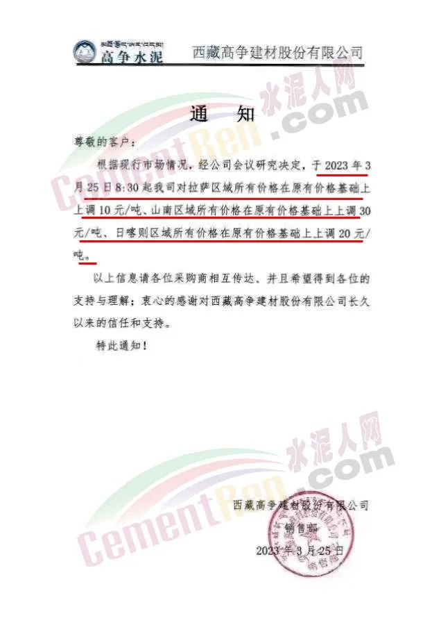 北京金隅水泥石家莊分公司通知,基于當(dāng)前市場(chǎng)變化情況,經(jīng)公司研究決定,自2023年3月26日0時(shí)起,公司銷(xiāo)售的水泥出廠(chǎng)價(jià)格在原價(jià)格基礎(chǔ)上上調(diào)30元/噸。