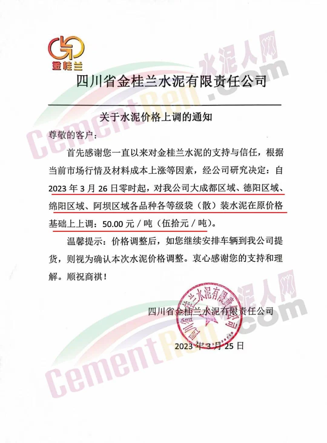 四川省金桂蘭水泥有限責(zé)任公司通知,根據(jù)當(dāng)前市場(chǎng)行情及材料成本上漲等因素,經(jīng)公司研究決定,自2023年3月26日零時(shí)起,對(duì)公司大成都區(qū)域、德陽(yáng)區(qū)域綿陽(yáng)區(qū)域、阿壩區(qū)域各品種各等級(jí)袋(散)裝水泥在原價(jià)格基礎(chǔ)上上調(diào)50元/噸。