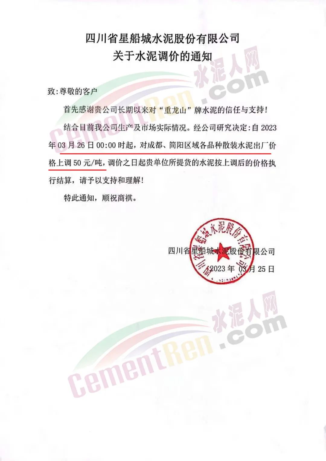 四川星船城水泥股份有限公司通知,自2023年03月26日0時(shí)起,對(duì)成都簡(jiǎn)陽(yáng)區(qū)域各品種散裝水泥出廠(chǎng)價(jià)格上調(diào)50元/噸。