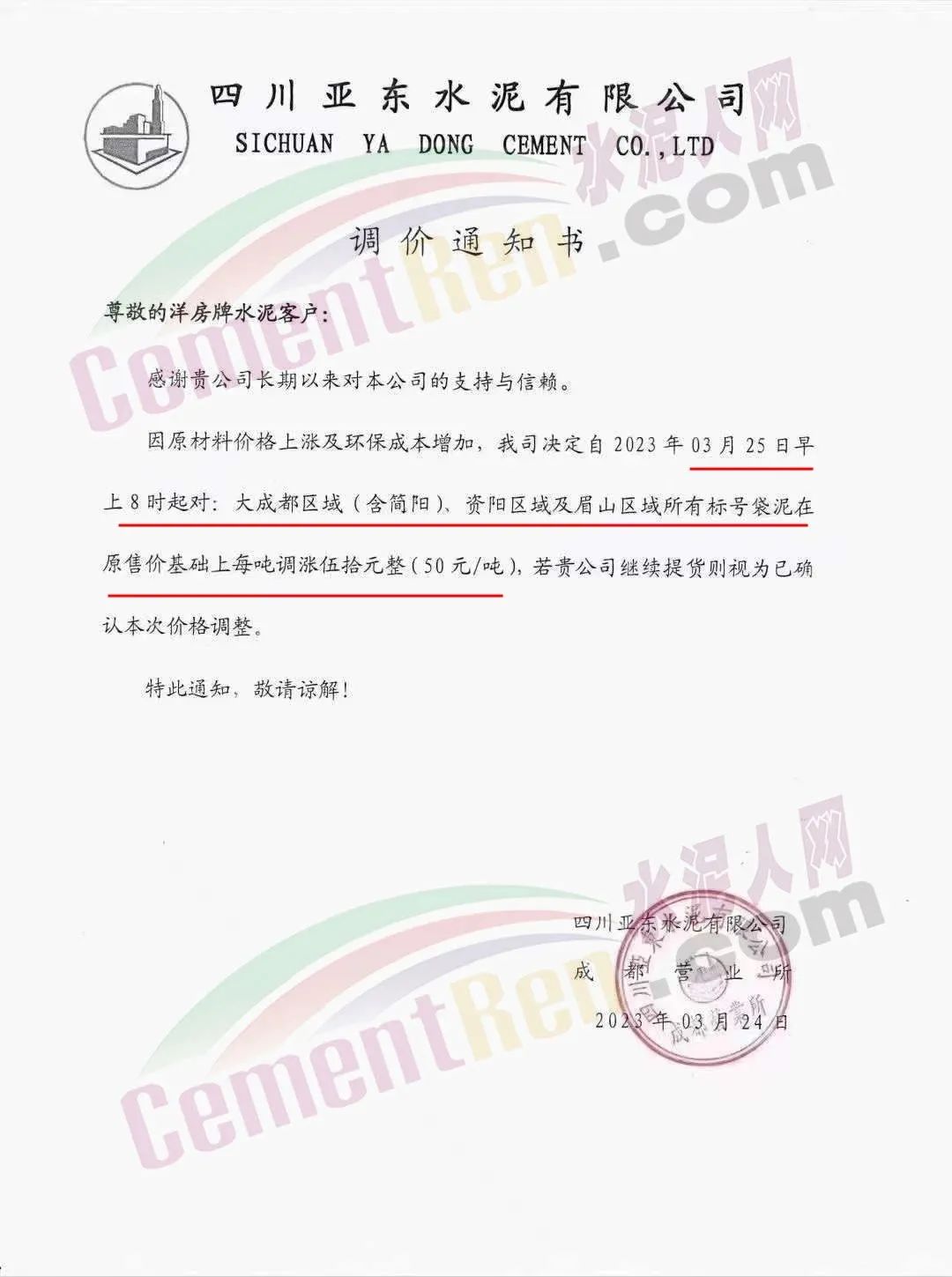 四川亞?wèn)|水泥通知,因原材料價(jià)格上漲及環(huán)保成本增加,公司決定自2023年03月25日早上8時(shí)起,對(duì)大成都區(qū)域(含簡(jiǎn)陽(yáng))、資陽(yáng)區(qū)域及眉山區(qū)域所有標(biāo)號(hào)袋泥在原售價(jià)基礎(chǔ)上每噸上調(diào)50元/噸。