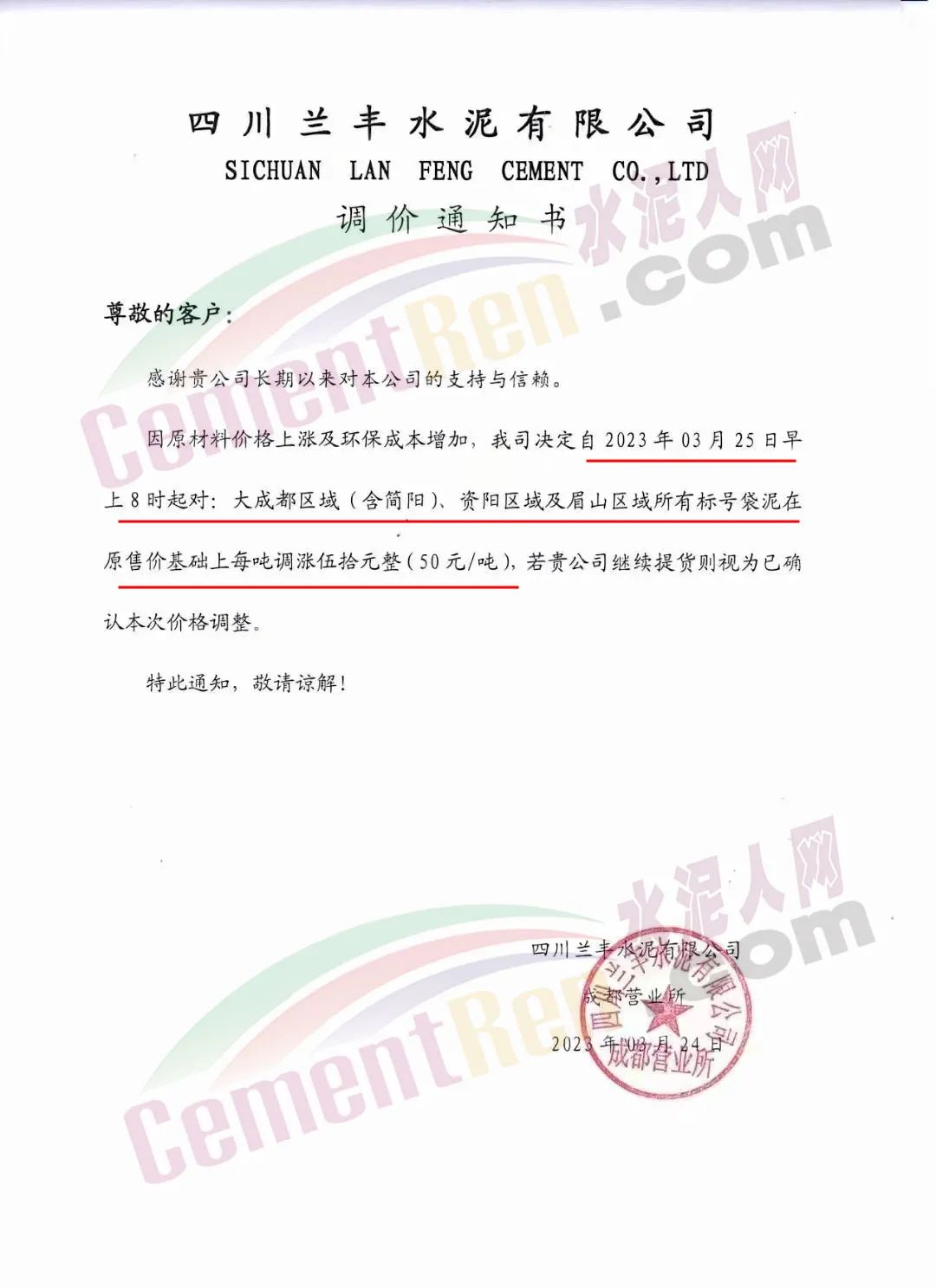 四川蘭豐水泥有限公司通知因原材料價(jià)格上漲及環(huán)保成本增加,公司決定自2023年03月25日早上8時(shí)起,對(duì)大成都區(qū)域(含簡(jiǎn)陽(yáng))、資陽(yáng)區(qū)域及眉山區(qū)域所有標(biāo)號(hào)袋泥在原售價(jià)基礎(chǔ)上每噸調(diào)漲50元/噸。