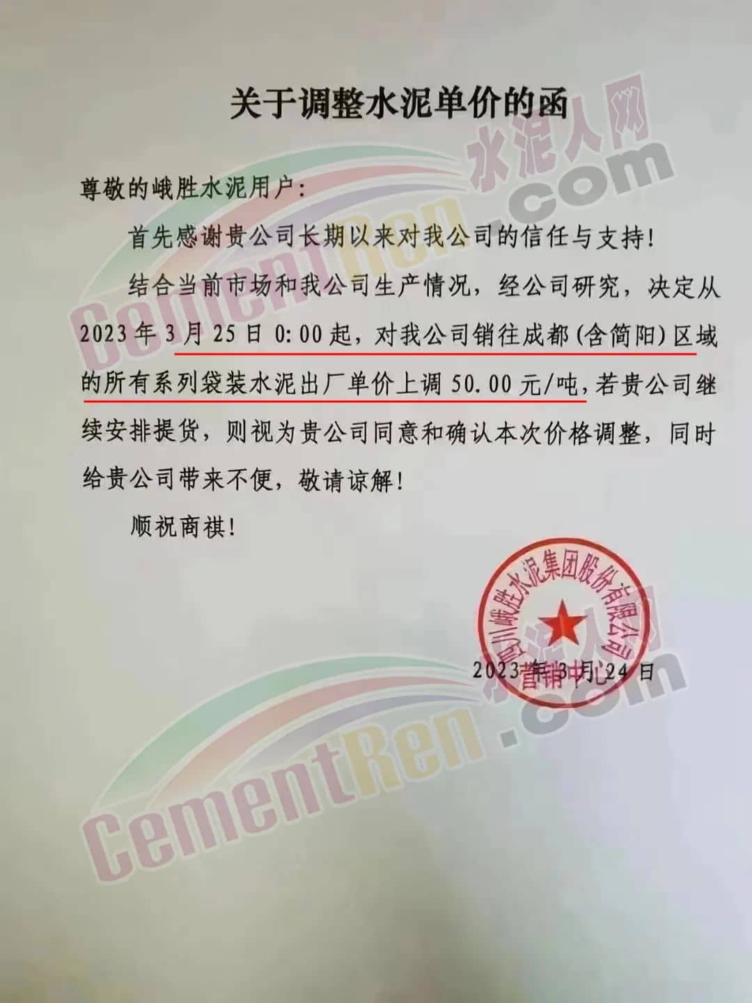 四川峨勝水泥集團(tuán)股份有限公司通知,結(jié)合當(dāng)前市場(chǎng)和公司生產(chǎn)情況,經(jīng)公司研究,決定從2023年3月25日0:00起,對(duì)銷(xiāo)往成都(含簡(jiǎn)陽(yáng))區(qū)域的所有系列袋裝水泥出廠(chǎng)單價(jià)上調(diào)50.00元/噸
