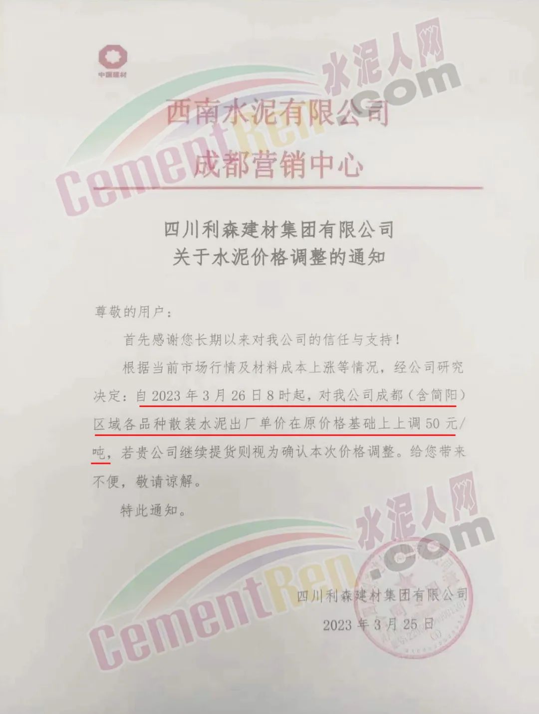 四川利森建材集團(tuán)有限公司通知,結(jié)合當(dāng)前市場(chǎng)和公司生產(chǎn)情況,經(jīng)公司研究,決定從2023年3月25日0:00起,對(duì)銷(xiāo)往成都(含簡(jiǎn)陽(yáng))區(qū)域的所有系列袋裝水泥出廠(chǎng)單價(jià)上調(diào)50元/噸。