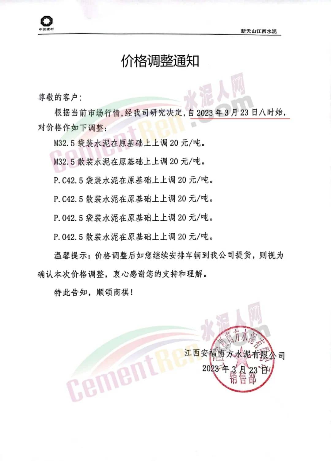 江西安福南方水泥有限公司通知,根據(jù)當(dāng)前市場(chǎng)行情,經(jīng)公司研究決定,自2023年3月23日八時(shí)對(duì)各標(biāo)號(hào)水泥價(jià)格在原基礎(chǔ)上上調(diào)20元/噸。