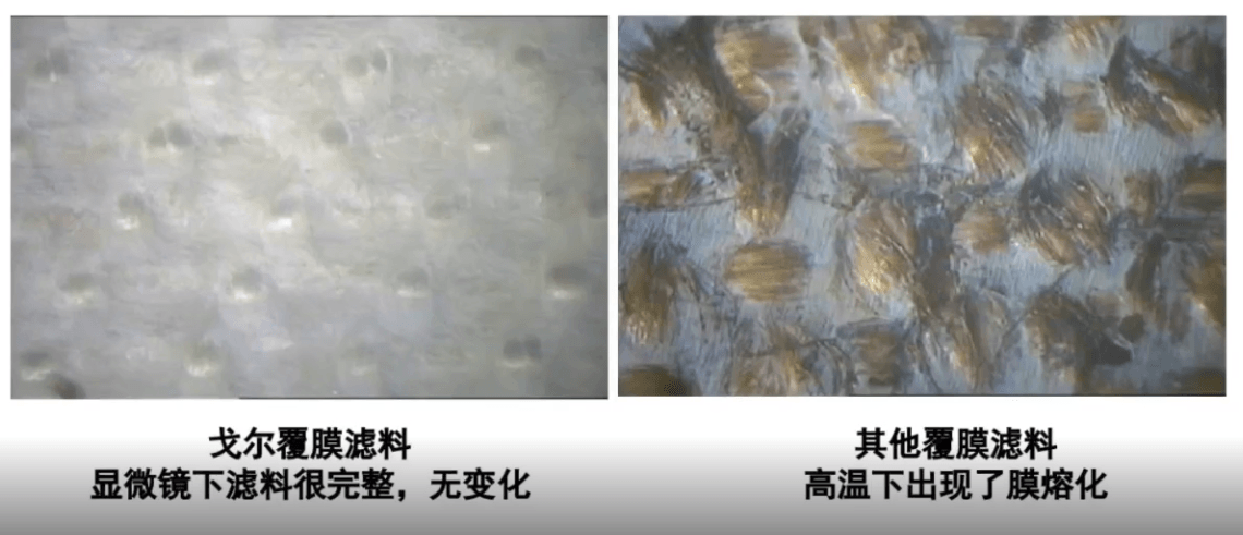 其他覆膜濾料高溫下易出現了膜熔化現象。因為膜受損,表面不再光滑,就達不到原有的清灰、攔截粉塵的效果,這種情況下粉塵極易泄露,且壓力會持續增加。