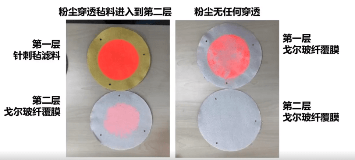 用兩層面料做測試,如果第一層性能好的話,第二層上就看不到粉塵的泄漏。從對比效果可見,兩層都采用戈爾玻纖覆膜濾料,第一層濾料攔截粉塵之后,光滑表示不容易掛灰,起到了有效清灰的效果。
