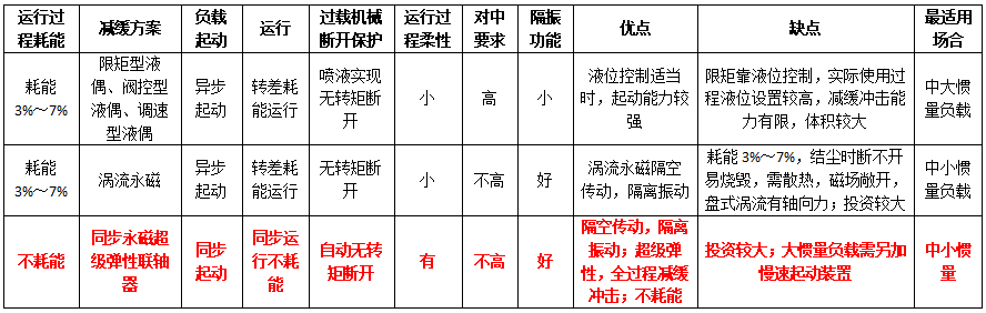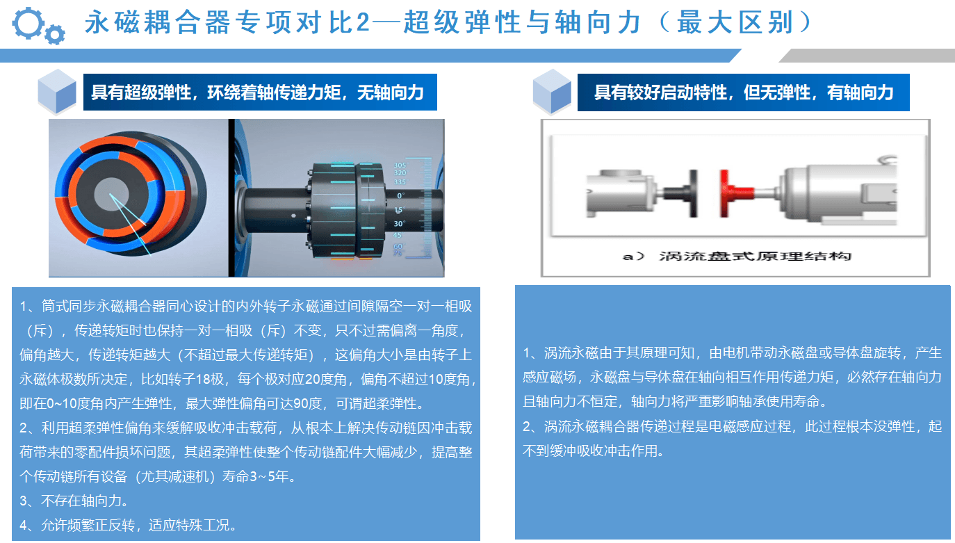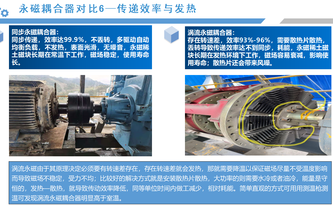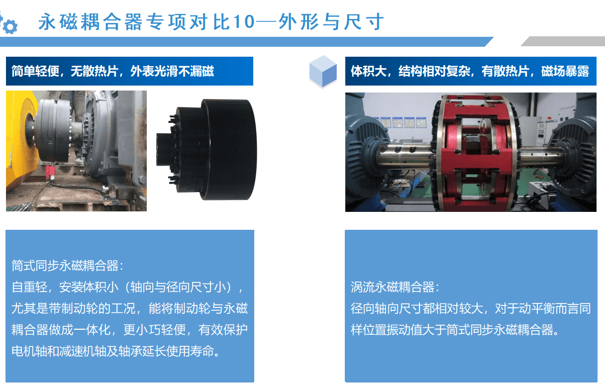 從以上的應(yīng)用案例來看,同步永磁耦合器的應(yīng)用效果會比較明顯,接下來,我們通過數(shù)據(jù)對比的形式,具體分析筒式同步全永磁耦合器與渦流永磁耦合器優(yōu)劣勢: