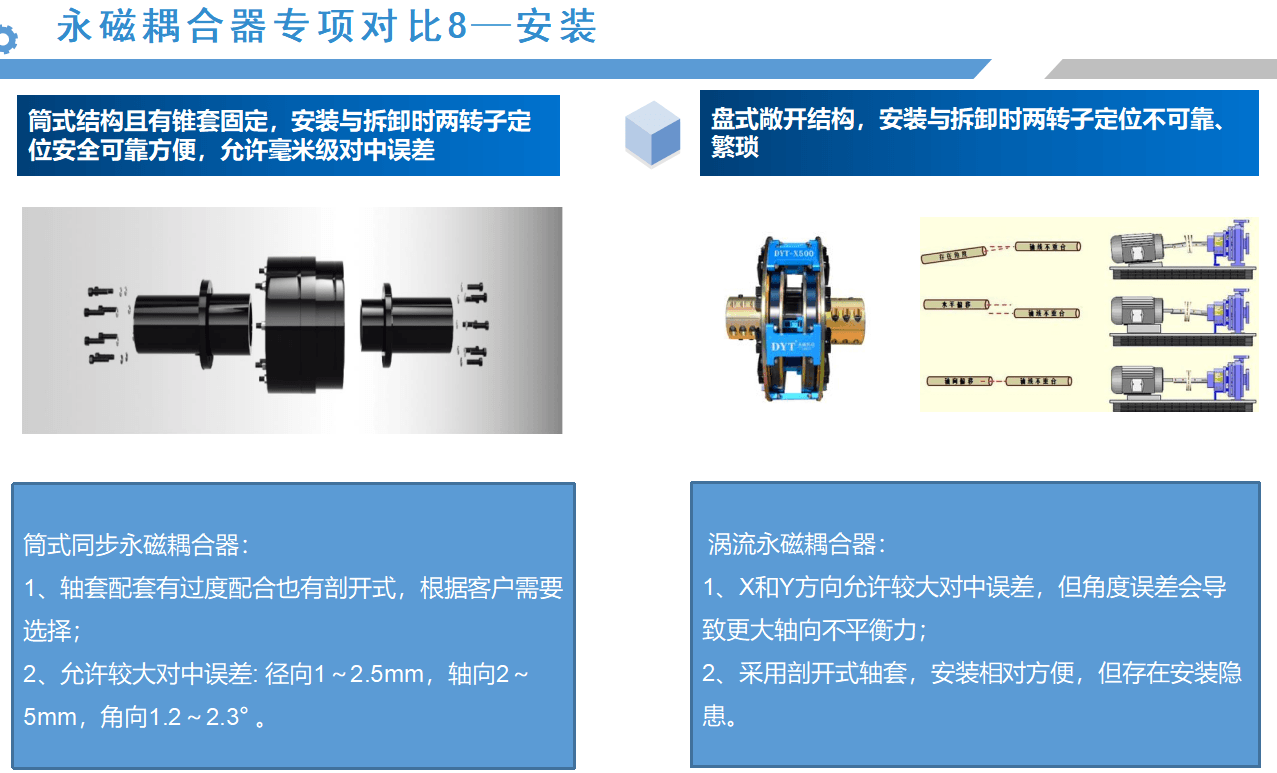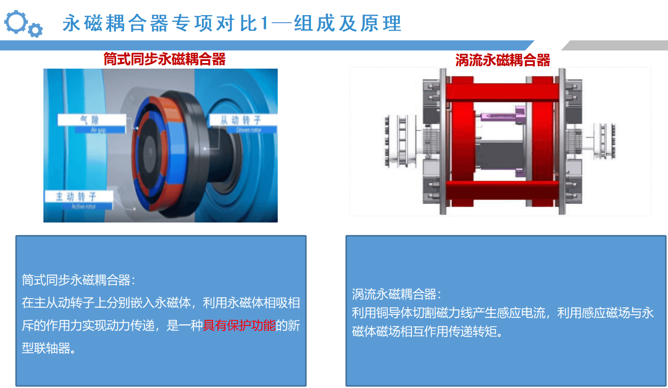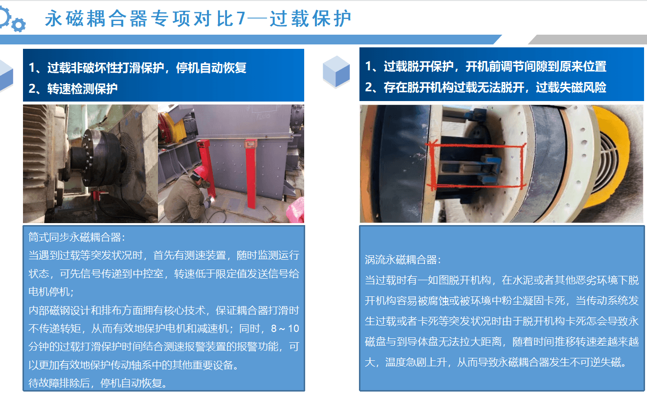從以上的應(yīng)用案例來看,同步永磁耦合器的應(yīng)用效果會比較明顯,接下來,我們通過數(shù)據(jù)對比的形式,具體分析筒式同步全永磁耦合器與渦流永磁耦合器優(yōu)劣勢: