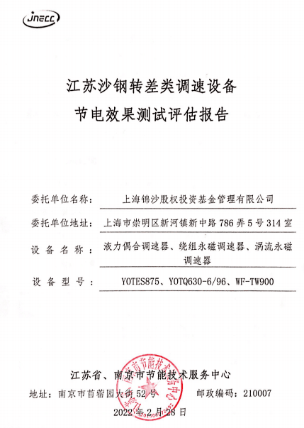 另外,上海錦沙股權(quán)投資基金管理有限公司委托江蘇省、南京市節(jié)能技術(shù)服務(wù)中心對(duì)江蘇沙鋼轉(zhuǎn)差類調(diào)速設(shè)備節(jié)電效果進(jìn)行了測(cè)試評(píng)估,評(píng)估的設(shè)備有:液力偶合調(diào)速器、繞組永磁調(diào)速器、渦流永磁調(diào)速器。江蘇省、南京市節(jié)能技術(shù)服務(wù)中心于2022年1月19日~20日在沙鋼對(duì)其電爐煉鋼二車間精煉除塵風(fēng)機(jī)、新布袋除塵風(fēng)機(jī)及煉鐵廠東區(qū)高爐車間2#礦槽除塵風(fēng)機(jī)配備的三臺(tái)轉(zhuǎn)差類調(diào)速設(shè)備進(jìn)行對(duì)比評(píng)估測(cè)試,評(píng)估測(cè)試各風(fēng)機(jī)在額定轉(zhuǎn)速及調(diào)速模式下的耗電情況,了解各臺(tái)轉(zhuǎn)差類調(diào)速設(shè)備在運(yùn)行現(xiàn)場(chǎng)的節(jié)電效果。并于2022年2月28日出具了評(píng)估報(bào)告。