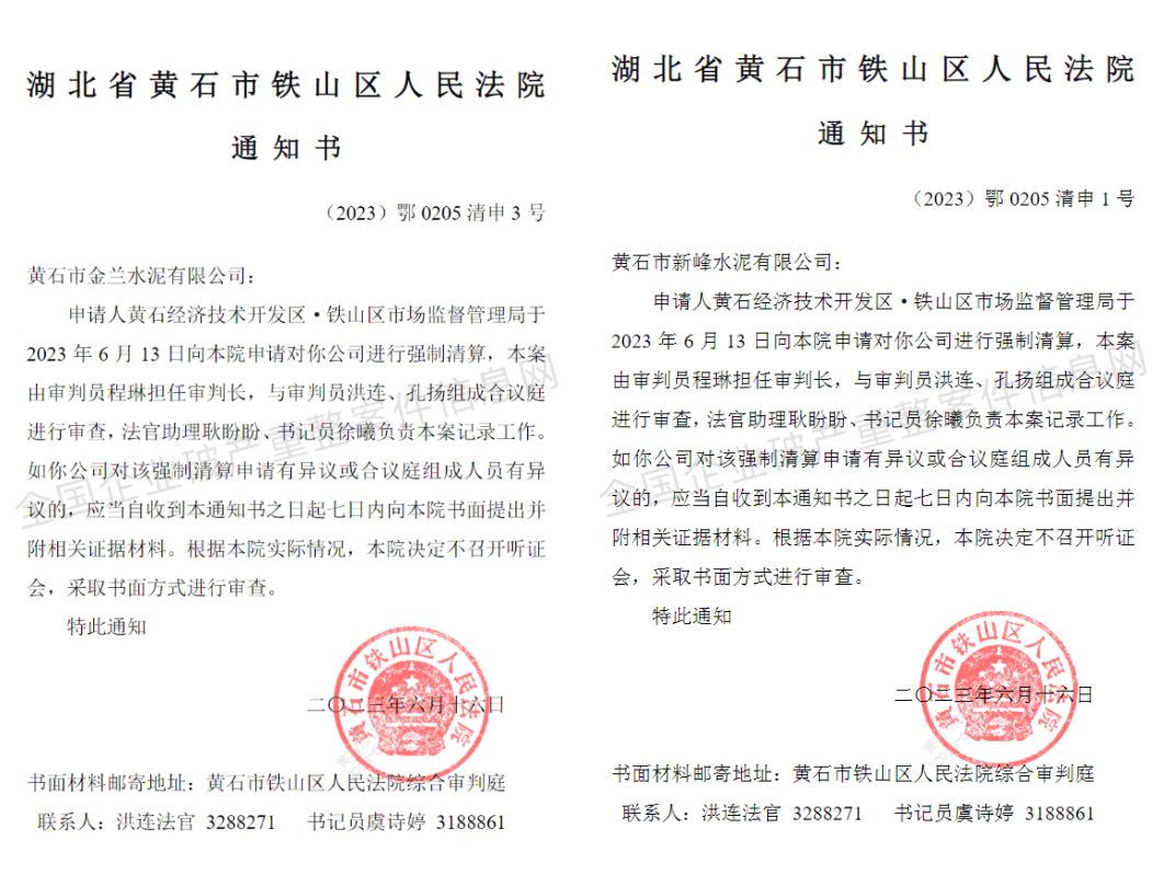 據全國企業破產重整案件信息網消息,近日,湖北黃石經濟技術開發區·鐵山區市場監督管理局于2023年6月13日向法院申請對黃石市金蘭水泥有限公司、黃石市新峰水泥有限公司兩家企業進行強制清算。