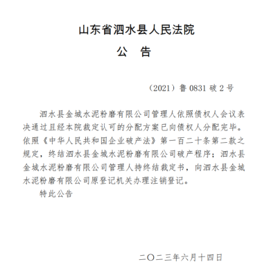 6月14日山東省泗水縣人民法院發布公告稱,泗水縣金城水泥粉磨有限公司管理人依照債權人會議表決通過且經本院裁定認可的分配方案已向債權人分配完畢。依照《中華人民共和國企業破產法》相關規定,終結泗水縣金城水泥粉磨有限公司破產程序;泗水縣金城水泥粉磨有限公司管理人持終結裁定書,向泗水縣金城水泥粉磨有限公司原登記機關辦理注銷登記。
