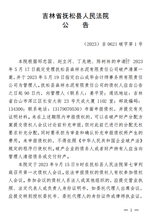 吉林省撫松縣人民法院公告于2023年5月17日裁定受理撫松縣森祥水泥有限責任公司破產清算一案,并于2023年5月19日指定白山成華會計師事務所有限責任公司為管理人。
