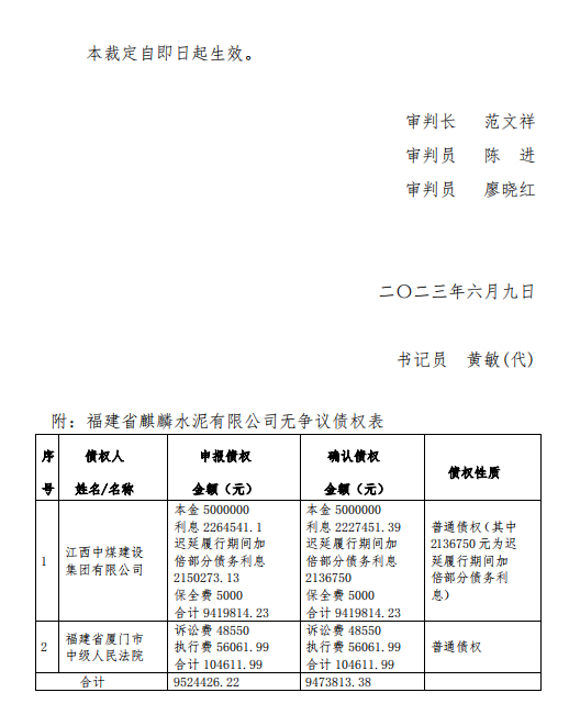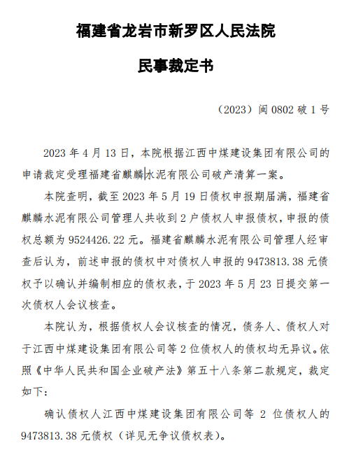 2023年4月13日,福建省龍巖市新羅區人民法院根據江西中煤建設集團有限公司的申請裁定受理福建省麒麟水泥有限公司破產清算一案。法院查明,截至2023年5月19日債權申報期屆滿,福建省麒麟水泥有限公司管理人共收到2戶債權人申報債權,申報的債權總額為9524426.22元。