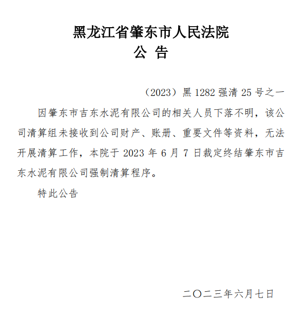因肇東市吉東水泥有限公司的相關人員下落不明,清算組未接收到公司財產、賬冊、重要文件等資料,無法開展清算工作,黑龍江省肇東市人民法院于2023年6月7日裁定終結肇東市吉東水泥有限公司強制清算程序。