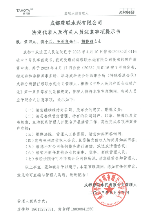 成都市雙流區人民法院于2023年4月10日裁定受理成都蓉聯水泥有限公司提出的破產清算申請,并于2023年4月17日指定泰和泰律師事務所、畢馬威華振會計師事務所特殊普通合伙成都分所擔任蓉聯水泥公司管理人。