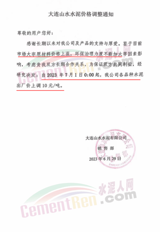 同期,大連天瑞水泥有限公司通知,鑒于目前市場(chǎng)大宗原材料成本上漲等因素影響,公司經(jīng)研究決定,自2023年6月30日8:00起,公司各品種水泥出廠價(jià)上調(diào)10元/噸。