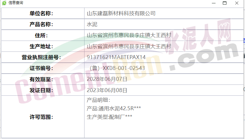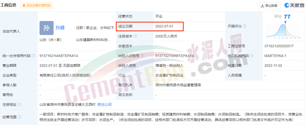 據(jù)查詢山東建磊新材料科技有限公司于2022年7月1日成立,截至7月1日剛好成立一年。企業(yè)注冊(cè)信息顯示,經(jīng)營(yíng)范圍為新材料技術(shù)推廣服務(wù);非金屬礦物制品制造;非金屬礦及制品銷售;輕質(zhì)建筑材料銷售;水泥制品銷售;水泥制品制造,許可項(xiàng)目為水泥生產(chǎn)。