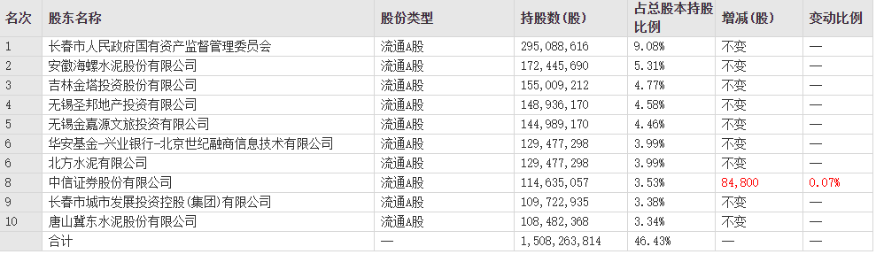 亞泰集團(tuán)十大股東中,海螺水泥以持股比例5.31%排名第2,北方水泥持股3.99%排名第6,冀東水泥持股3.34%排名第10。