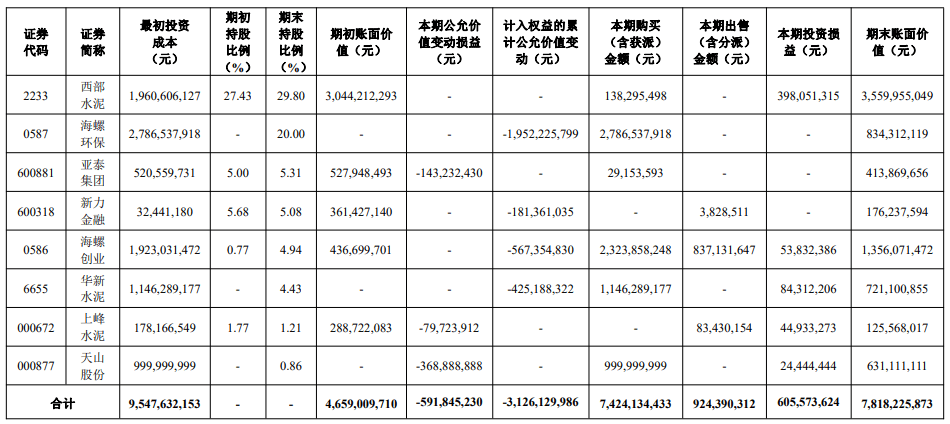 報(bào)告顯示,海螺水泥持有的新力金融、海螺創(chuàng)業(yè)、華新水泥計(jì)入“其他權(quán)益工具投資”科目,海螺環(huán)保、西部水泥計(jì)入“長(zhǎng)期股權(quán)投資”科目,亞泰集團(tuán)、上峰水泥、天山股份計(jì)入“交易性金融資產(chǎn)”科目。