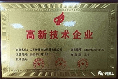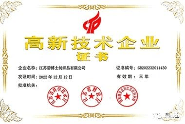 近日,江蘇碧博士紡織品有限公司(以下簡稱“碧博士”)成功獲得國家“高新技術(shù)企業(yè)”認(rèn)定殊榮,正式邁入國家高新技術(shù)企業(yè)行列。本次成功入選高新技術(shù)企業(yè),是國家相關(guān)部門對碧博士多年來工作的肯定,也是碧博士產(chǎn)品研發(fā)實力與創(chuàng)新能力的體現(xiàn)。