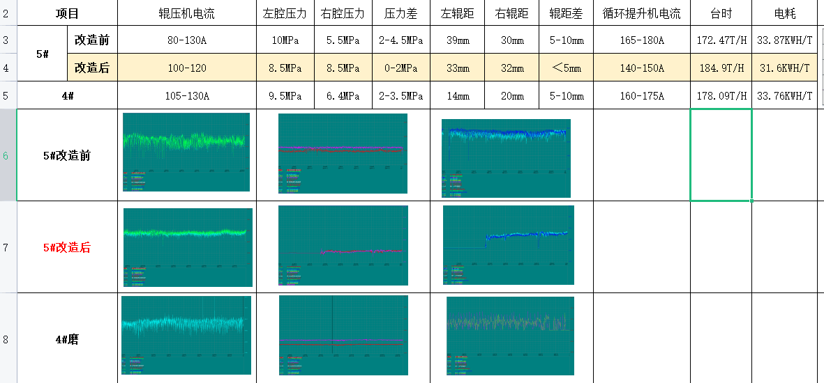 例: 水泥粉磨生產(chǎn)線,均為160-140輥壓機+Φ4.8m×9.5m管磨機組成的聯(lián)合粉磨系統(tǒng)。改造前,輥壓機動定輥運行電流大多時間在95A以下,兩側(cè)壓力差大,輥縫偏差大時達到18mm,系統(tǒng)粉磨電耗高,產(chǎn)量低。分析認為,根本原因出在輥壓機系統(tǒng),表現(xiàn)為輥壓機喂料裝置喂料不穩(wěn)定,液壓系統(tǒng)和電氣控制的功能發(fā)揮存在不足。
